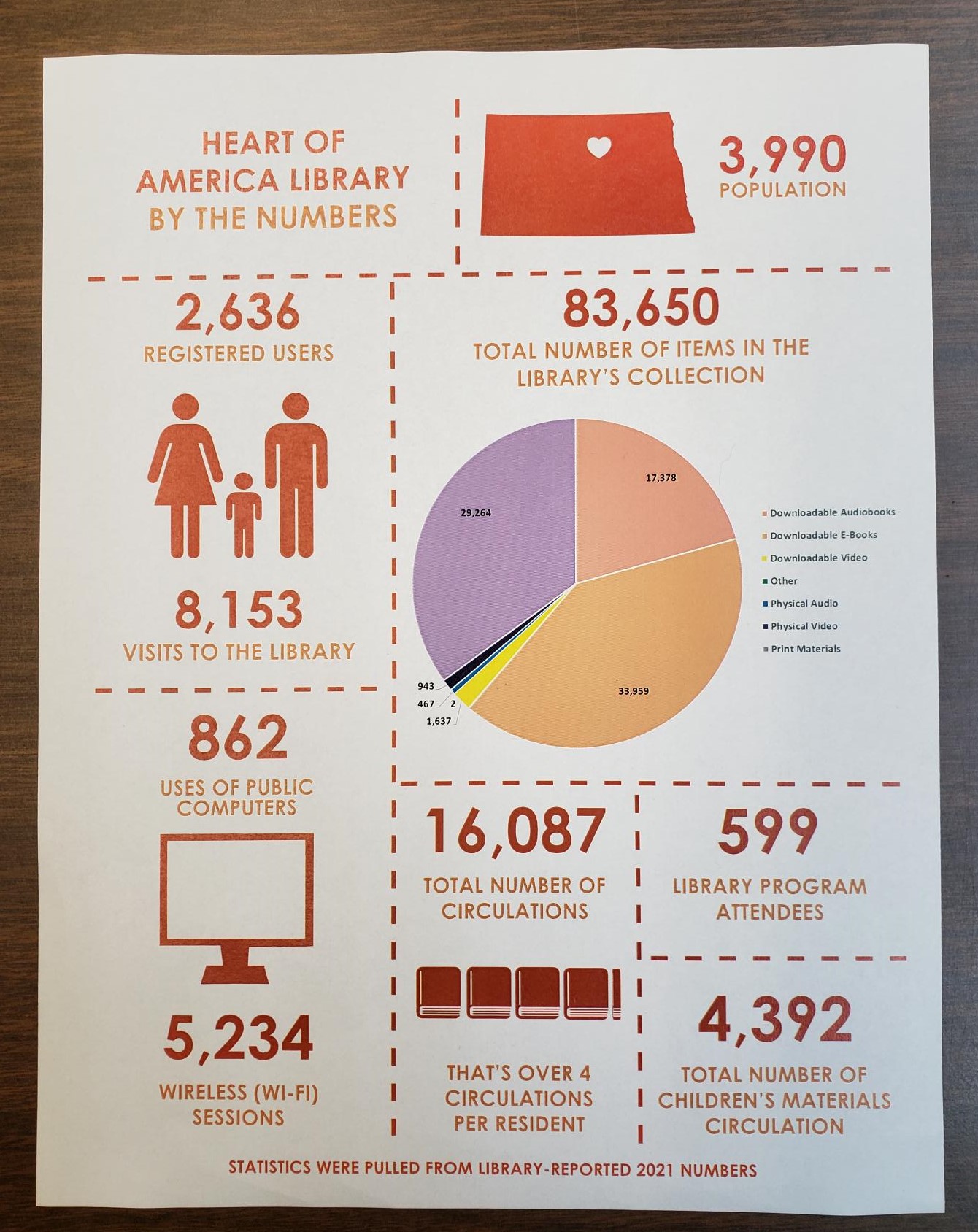 Each year, public libraries are required to submit data to the North Dakota State Library through the Public Library Survey. The State Library provided the Heart of America Library with a 2021 fact sheet. This graphic page has been posted to Facebook and is hanging in the Library’s entry way. Here are the 2021 statistics: