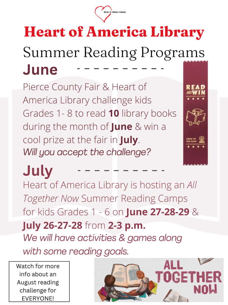 Pierce County Fair and Heart of America Library are partnering for a summer reading challenge for children grades one (1) to eight (8). Children are asked to read 10 library books during the month of June. Once complete the children will receive a Read and Win ribbon from the library, then they can present that earned ribbon to the Pierce County Fair for a coupon for a cool prize.
