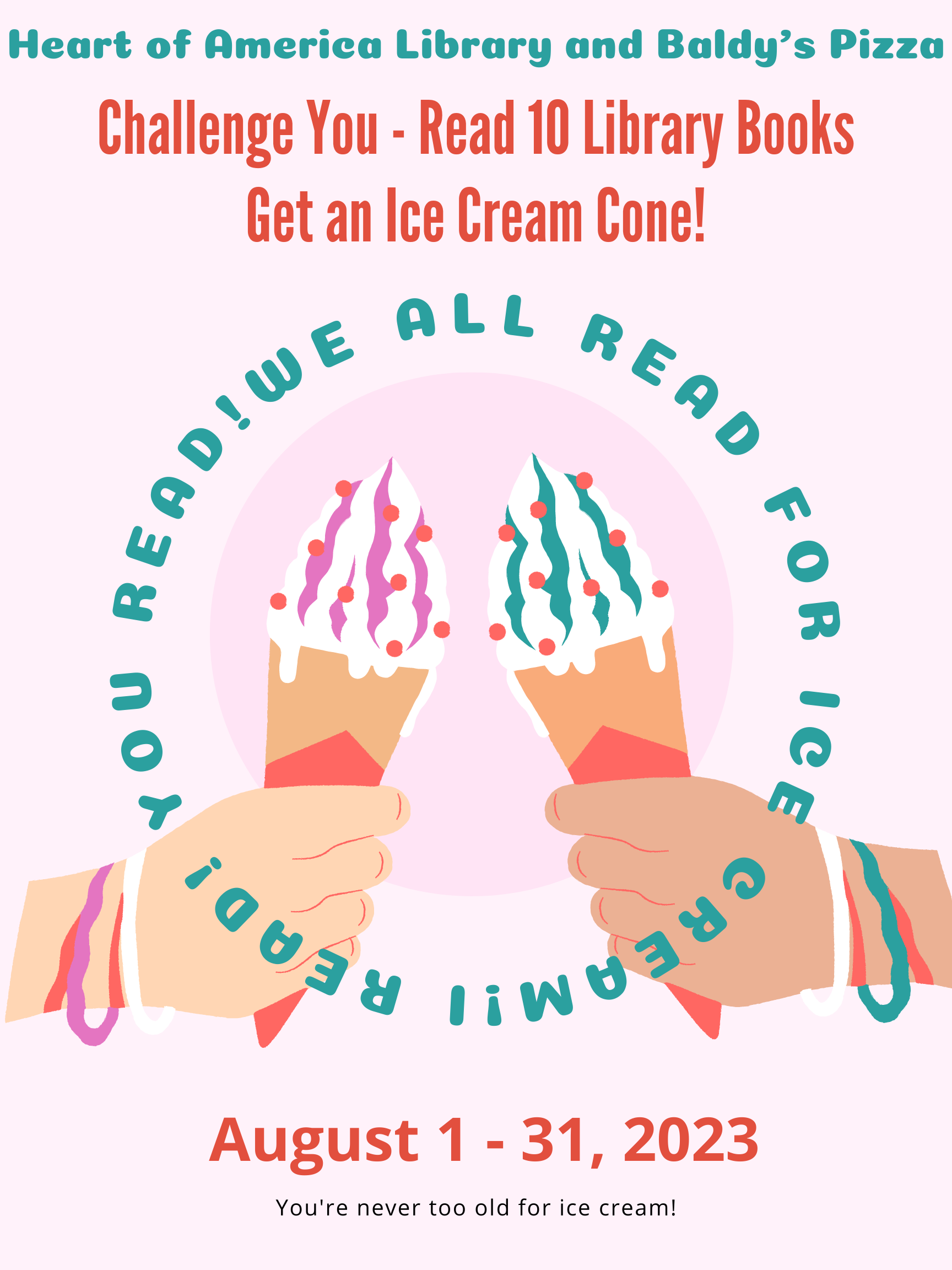 I read! You read! We ALL read for Ice Cream! Your Heart of America Library is partnering with Baldy‘s Pizza to bring you a reading challenge for the month of August. Your challenge is to read 10 Library books and you’ll get a FREE ice cream cone. Do you accept? (Yes, adults can participate, too!!)