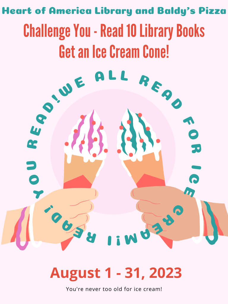 August started our Read for Ice Cream promotion with Baldy’s Pizza. We’ve had 24 people read for ice cream as of today. There is still time! Read 10 library books and get a token for an ice cream cone from Baldy’s Pizza. That simple. Anyone can participate!