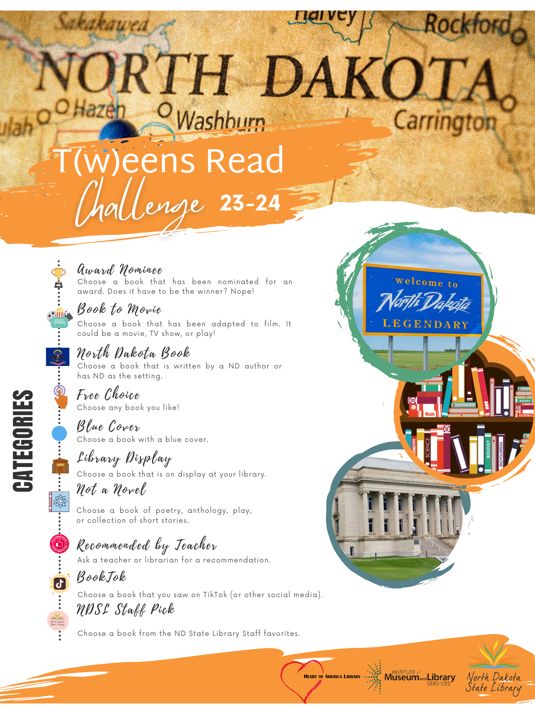 We are starting a T(w)eens Read Challenge to run September 1, 2023 to March 1, 2024. T(w)eens age 10 – 19 are asked to read eight (8) books from ten (10) different categories. The categories include Award Nominee, Book to Movie, North Dakota Book, Free Choice, Blue Cover, Library Display, Not a Novel, Recommended by Teacher, BookTok, NDSL Staff Pick. We will distribute information to each of the schools for our t(w)eens to pick up and participate, if they choose. Once books are read, logged, and forms dropped off, their name will be entered into a drawing for a prize.