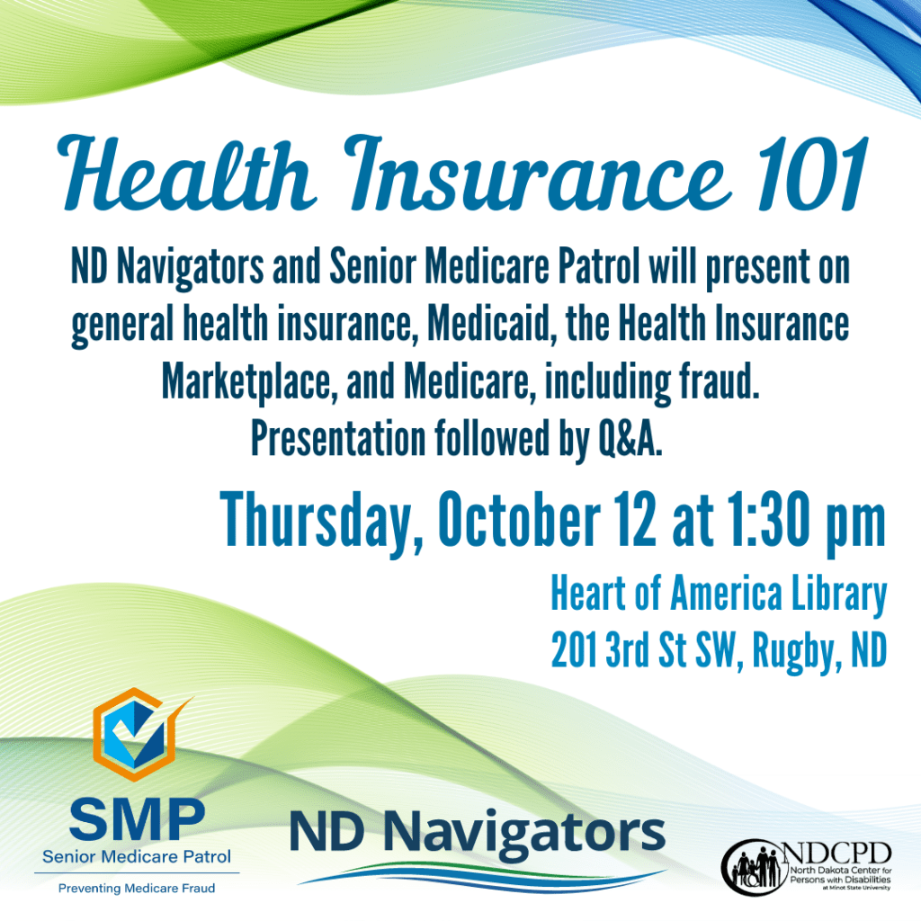 October is Health Literacy Month. The ever changing landscape of healthcare and health insurance is hard to navigate. HOA Library has invited ND Navigators and Senior Medicare Patrol to come on Thursday, October 12 at 1:30 p.m. so they can present Health Insurance 101 and answer your insurance related questions. They can answer general insurance, Medicaid and Medicaid Expansion, and Medicare questions. Please join us for this informative presentation.