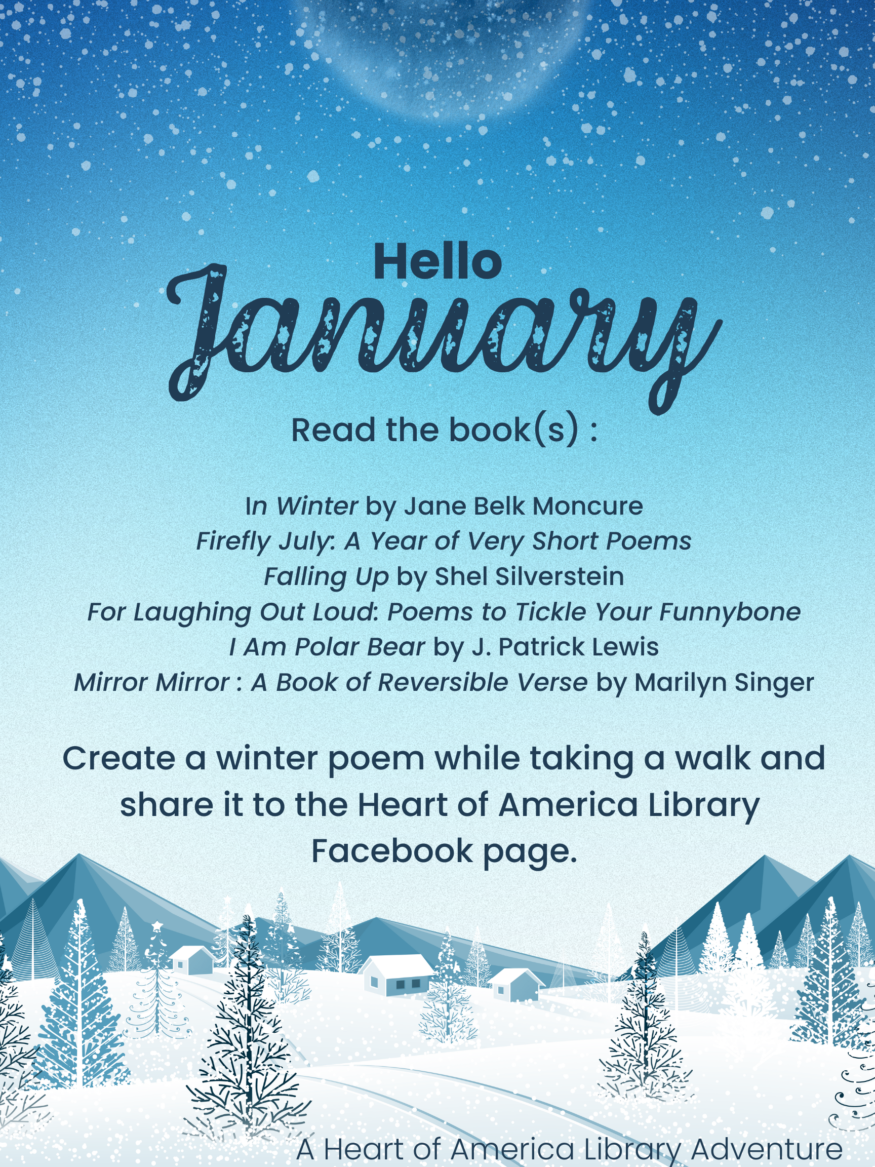 They have several options for tracking sheets on their website or on their app, but you can always find your own way of tracking your time outside. You can stop by the library and we’ll help you print a tracker off, too. We’ll also share a picture of suggestions for getting your hours in each month for our winter weather. We might suggest a book and then an adventure related to the book. Really just getting outside and enjoying all that is available to us is the adventure.