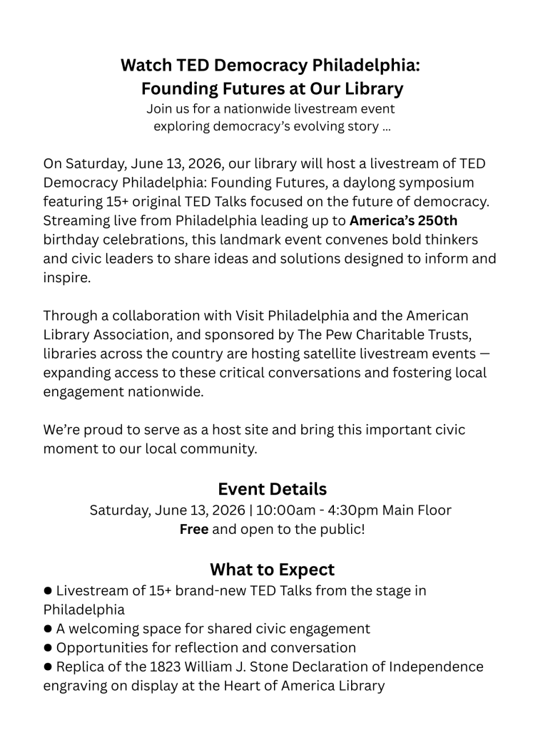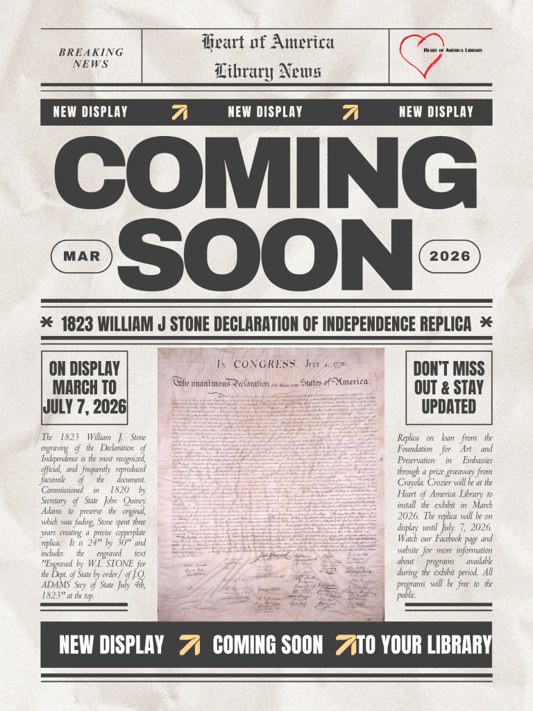 Heart of America Library will be receiving a replica of the 1823 William J. Stone Declaration of Independence as a loan to display for America 250!